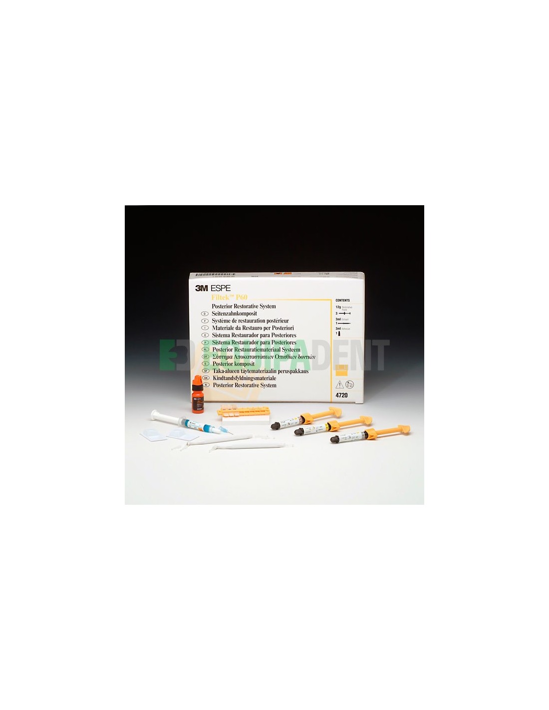 3 jeringas de 4 gr.en colores A3,B2,C2 + 3 ml. Scotchbond 1 Adhesivo + 1 jeringa Gel grabador y Accesorios.